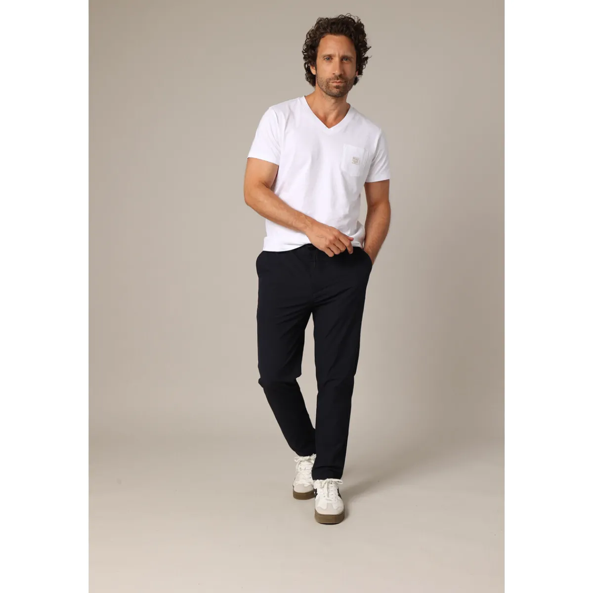 Pantalon pour homme JULIO, au style casual et moderne.Ce pantalon présente une coupe droite confortable avec une taille élastiquée au dos, un cordon de serrage à l’avant, une fermeture zippée avec bouton, ainsi que des passants pour ceinture. Il est doté de deux poches italiennes sur les côtés et deux poches passepoilées au dos. Sa matière légèrement stretch et son tombé net en font une pièce idéale pour un look urbain décontracté au quotidien.